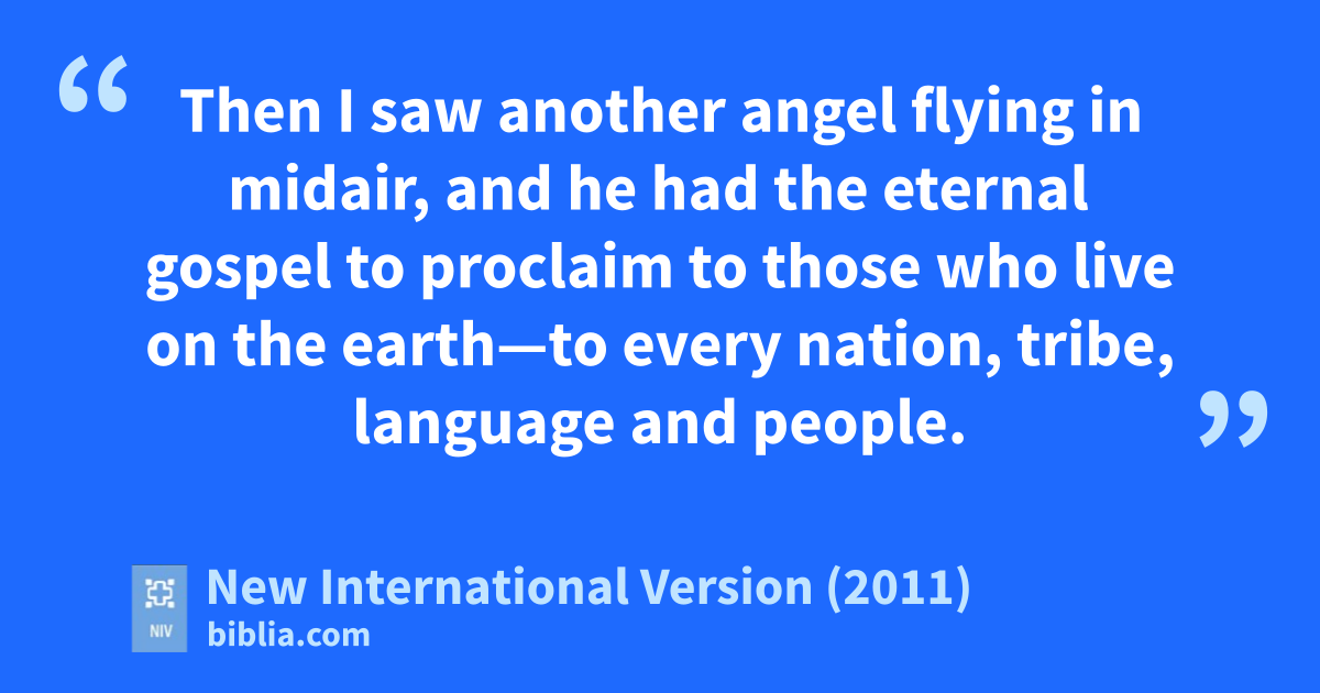 6 Then I saw another angel flying in midair,q and he had the eternal gospel to proclaim to those who live on the earthr—to every nation, tribe, language and people.s 7 He said in a loud voice, “Fear Godt and give him glory,u because the hour of his judgment has come. Worship him who madev the heavens, the earth, the sea and the springs of water.”w
