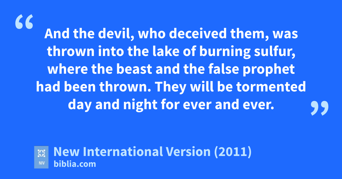 7 When the thousand years are over,j Satan will be released from his prison 8 and will go out to deceive the nationsk in the four corners of the earthl—Gog and Magogm—and to gather them for battle.n In number they are like the sand on the seashore.o 9 They marched across the breadth of the earth and surroundedp the camp of God’s people, the city he loves.q But fire came down from heavenr and devoured them. 10 And the devil, who deceived them,s was thrown into the lake of burning sulfur,t where the beastu and the false prophetv had been thrown. They will be tormented day and night for ever and ever.w