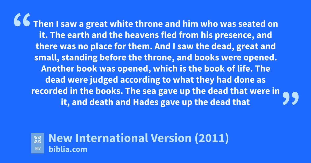 11 Then I saw a great white thronex and him who was seated on it. The earth and the heavens fled from his presence,y and there was no place for them. 12 And I saw the dead, great and small,z standing before the throne, and books were opened.a Another book was opened, which is the book of life.b The dead were judgedc according to what they had doned as recorded in the books. 13 The sea gave up the dead that were in it, and death and Hadese gave up the deadf that were in them, and each person was judged according to what they had done.g 14 Then deathh and Hadesi were thrown into the lake of fire.j The lake of fire is the second death.k 15 Anyone whose name was not found written in the book of lifel was thrown into the lake of fire.