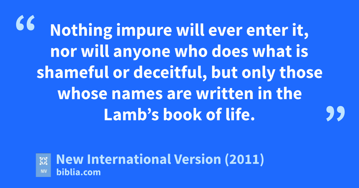 22 I did not see a templeg in the city, because the Lord God Almightyh and the Lambi are its temple. 23 The city does not need the sun or the moon to shine on it, for the glory of Godj gives it light,k and the Lambl is its lamp. 24 The nations will walk by its light, and the kings of the earth will bring their splendor into it.m 25 On no day will its gatesn ever be shut,o for there will be no night there.p 26 The glory and honor of the nations will be brought into it.q 27 Nothing impure will ever enter it, nor will anyone who does what is shameful or deceitful,r but only those whose names are written in the Lamb’s book of life.s