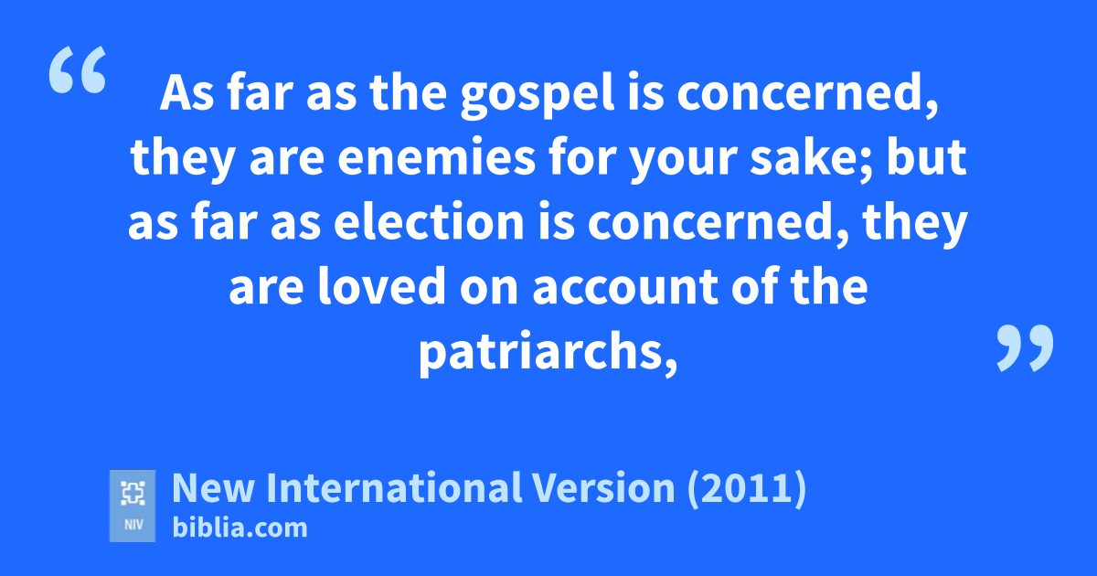 28 As far as the gospel is concerned, they are enemiess for your sake; but as far as election is concerned, they are loved on account of the patriarchs,t 29 for God’s gifts and his callu are irrevocable.v 30 Just as you who were at one time disobedientw to God have now received mercy as a result of their disobedience, 31 so they too have now become disobedient in order that they too may nowh receive mercy as a result of God’s mercy to you. 32 For God has bound everyone over to disobediencex so that he may have mercy on them all.
