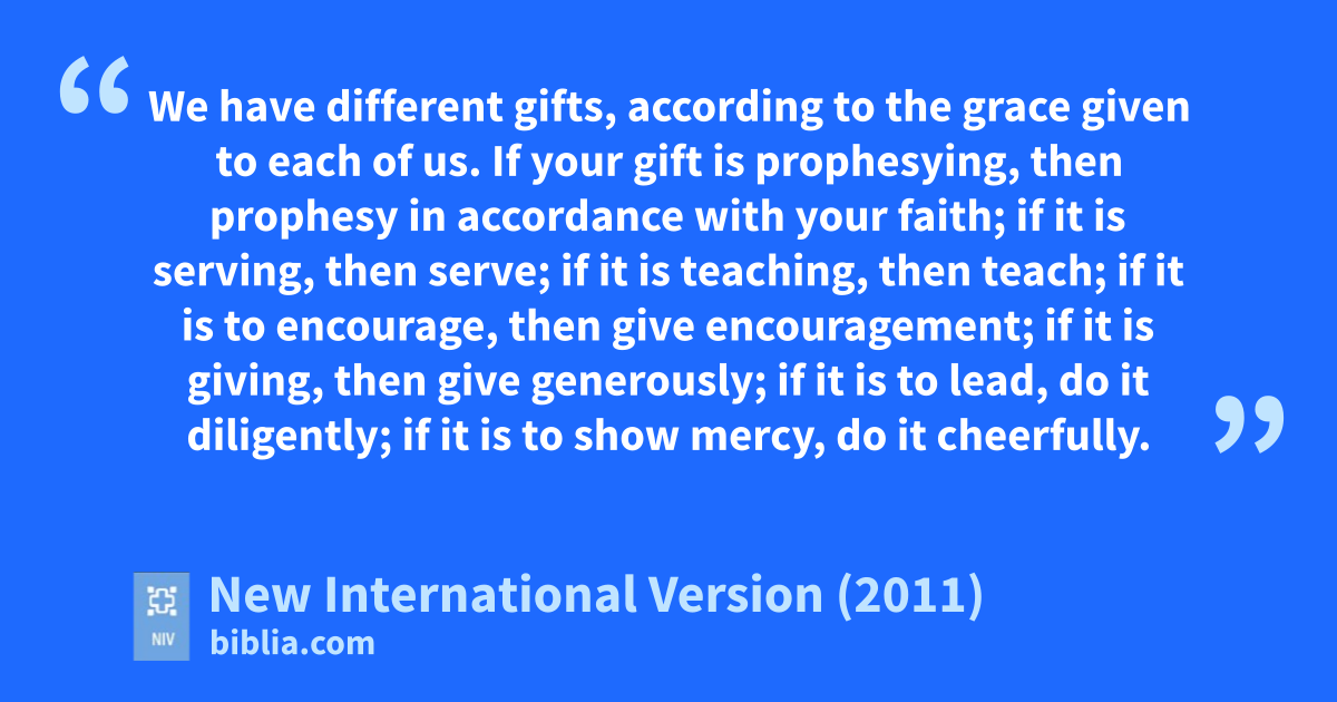 3 For by the grace given mem I say to every one of you: Do not think of yourself more highly than you ought, but rather think of yourself with sober judgment, in accordance with the faith God has distributed to each of you. 4 For just as each of us has one body with many members, and these members do not all have the same function,n 5 so in Christ we, though many, form one body,o and each member belongs to all the others. 6 We have different gifts,p according to the grace given to each of us. If your gift is prophesying,q then prophesy in accordance with youra faith;r 7 if it is serving, then serve; if it is teaching, then teach;s 8 if it is to encourage, then give encouragement;t if it is giving, then give generously;u if it is to lead,b do it diligently; if it is to show mercy, do it cheerfully.