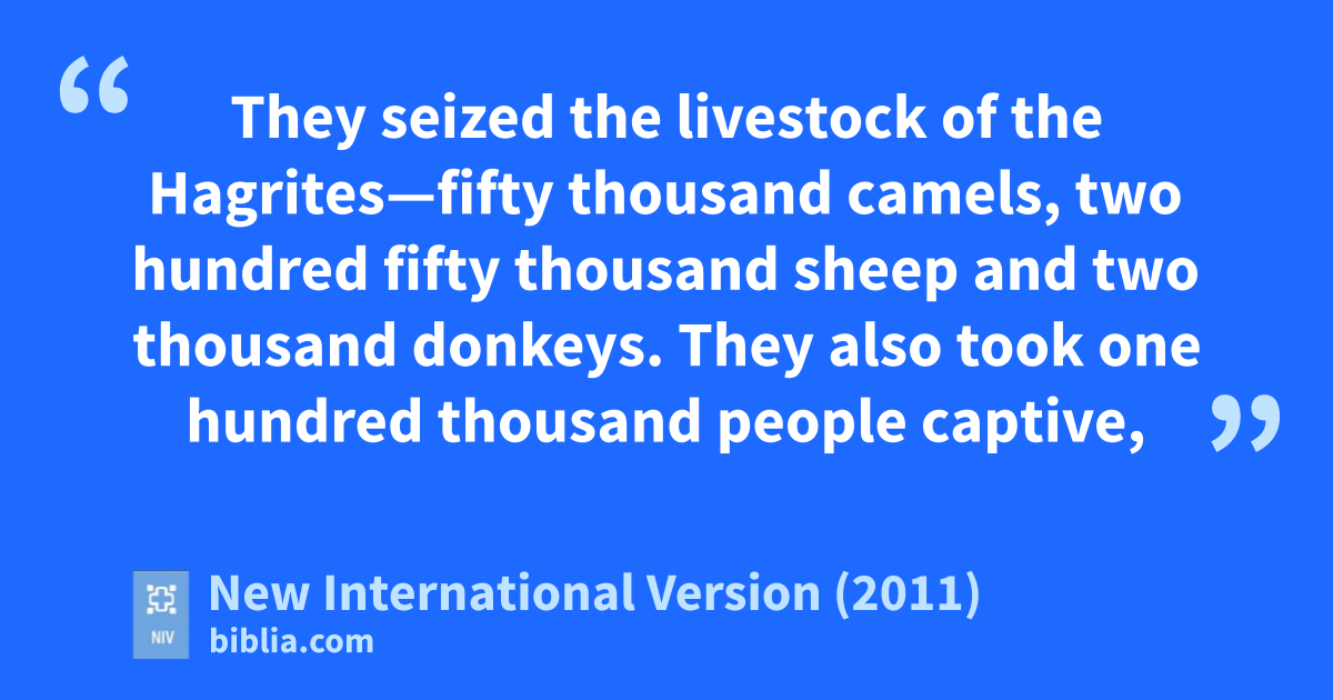 18 The Reubenites, the Gadites and the half-tribe of Manasseh had 44,760 men ready for military services—able-bodied men who could handle shield and sword, who could use a bow, and who were trained for battle. 19 They waged war against the Hagrites, Jetur,t Naphish and Nodab. 20 They were helpedu in fighting them, and God delivered the Hagrites and all their allies into their hands, because they criedv out to him during the battle. He answered their prayers, because they trustedw in him. 21 They seized the livestock of the Hagrites—fifty thousand camels, two hundred fifty thousand sheep and two thousand donkeys. They also took one hundred thousand people captive, 22 and many others fell slain, because the battlex was God’s. And they occupied the land until the exile.y