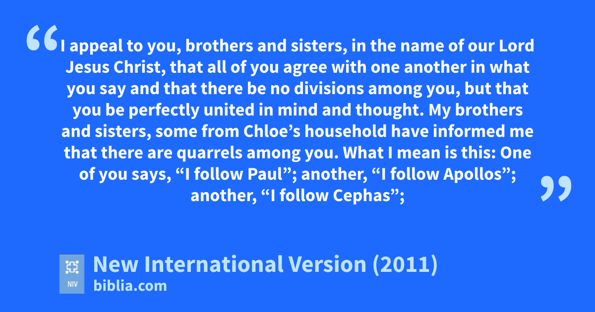 10 I appeal to you, brothers and sisters,a t in the name of our Lord Jesus Christ, that all of you agree with one another in what you say and that there be no divisions among you,u but that you be perfectly unitedv in mind and thought. 11 My brothers and sisters, some from Chloe’s householdw have informed me that there are quarrels among you. 12 What I mean is this: One of you says, “I follow Paul”;x another, “I follow Apollos”;y another, “I follow Cephasb”;z still another, “I follow Christ.”