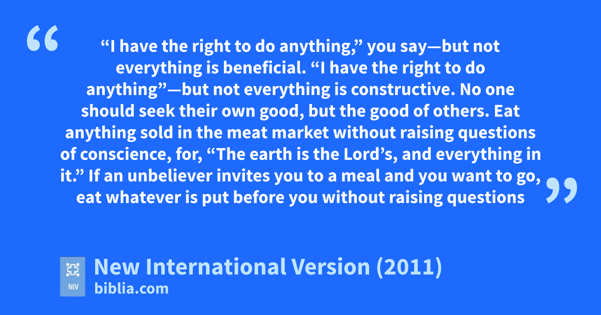 27 If an unbeliever invites you to a meal and you want to go, eat whatever is put before youd without raising questions of conscience. 28 But if someone says to you, “This has been offered in sacrifice,” then do not eat it, both for the sake of the one who told you and for the sake of conscience.e 29 I am referring to the other person’s conscience, not yours. For why is my freedomf being judged by another’s conscience? 30 If I take part in the meal with thankfulness, why am I denounced because of something I thank God for?g