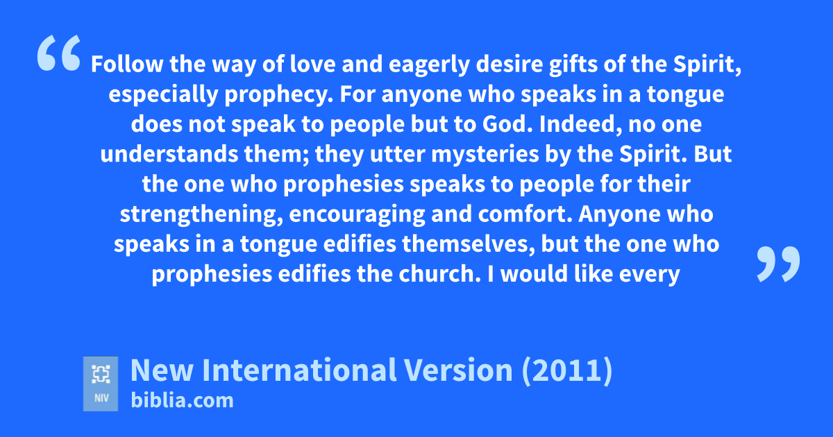 14 Follow the way of loven and eagerly desireo gifts of the Spirit,p especially prophecy.q 2 For anyone who speaks in a tonguea r does not speak to people but to God. Indeed, no one understands them;s they utter mysteriest by the Spirit. 3 But the one who prophesies speaks to people for their strengthening,u encouragingv and comfort. 4 Anyone who speaks in a tonguew edifiesx themselves, but the one who prophesiesy edifies the church. 5 I would like every one of you to speak in tongues,b but I would rather have you prophesy.z The one who prophesies is greater than the one who speaks in tongues,c unless someone interprets, so that the church may be edified.a