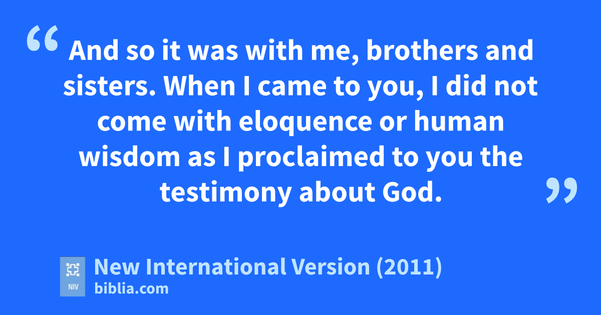 2 And so it was with me, brothers and sisters. When I came to you, I did not come with eloquence or human wisdomm as I proclaimed to you the testimony about God.a 2 For I resolved to know nothing while I was with you except Jesus Christ and him crucified.n 3 I came to youo in weaknessp with great fear and trembling.q 4 My message and my preaching were not with wise and persuasive words,r but with a demonstration of the Spirit’s power,s 5 so that your faith might not rest on human wisdom, but on God’s power.t