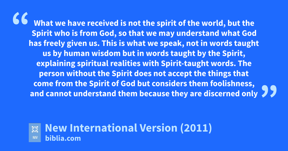 The Spirit searches all things, even the deep things of God. 11 For who knows a person’s thoughtse except their own spiritf within them? In the same way no one knows the thoughts of God except the Spirit of God. 12 What we have received is not the spiritg of the world,h but the Spirit who is from God, so that we may understand what God has freely given us. 13 This is what we speak, not in words taught us by human wisdomi but in words taught by the Spirit, explaining spiritual realities with Spirit-taught words.c 14 The person without the Spirit does not accept the things that come from the Spirit of Godj but considers them foolishness,k and cannot understand them because they are discerned only through the Spirit. 15 The person with the Spiritl makes judgments about all things, but such a person is not subject to merely human judgments, 16 for,
