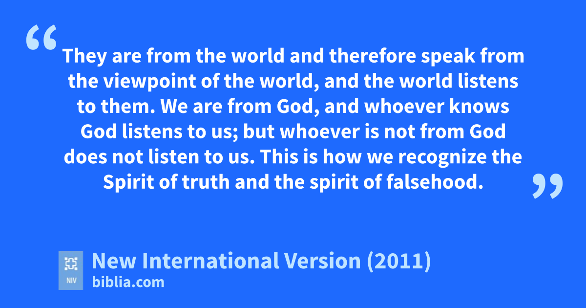 4 You, dear children,z are from God and have overcome them,a because the one who is in youb is greater than the one who is in the world.c 5 They are from the worldd and therefore speak from the viewpoint of the world, and the world listens to them. 6 We are from God, and whoever knows God listens to us; but whoever is not from God does not listen to us.e This is how we recognize the Spirita of truthf and the spirit of falsehood.g