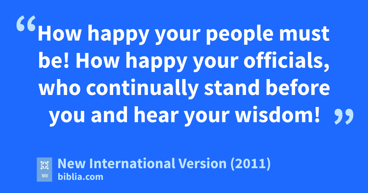 6 She said to the king, “The report I heard in my own country about your achievements and your wisdom is true. 7 But I did not believet these things until I came and saw with my own eyes. Indeed, not even half was told me; in wisdom and wealthu you have far exceeded the report I heard. 8 How happy your people must be! How happy your officials, who continually stand before you and hearv your wisdom! 9 Praisew be to the Lord your God, who has delighted in you and placed you on the throne of Israel. Because of the Lord’s eternal lovex for Israel, he has made you king to maintain justicey and righteousness.”