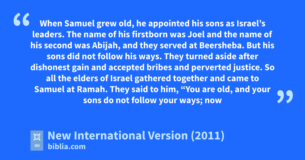 8 When Samuel grew old, he appointedp his sons as Israel’s leaders.a 2 The name of his firstborn was Joel and the name of his second was Abijah,q and they served at Beersheba.r 3 But his sonss did not follow his ways. They turned asidet after dishonest gain and accepted bribesu and pervertedv justice.