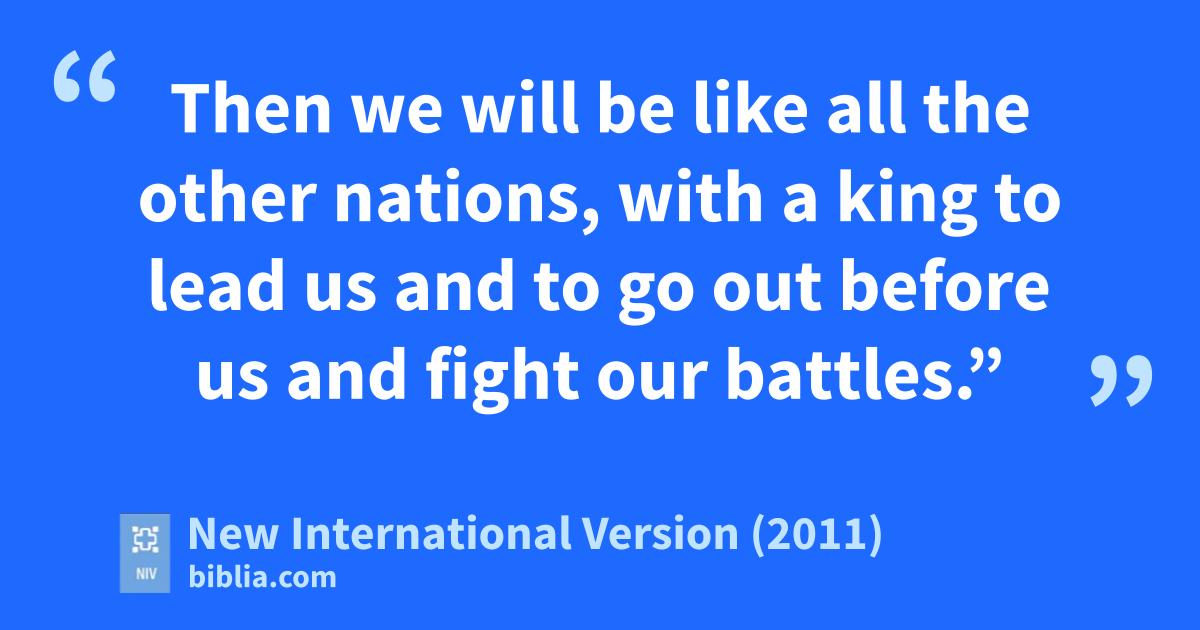 19 But the people refusedt to listen to Samuel. “No!” they said. “We wantu a kingv over us. 20 Then we will be like all the other nations,w with a king to lead us and to go out before us and fight our battles.”