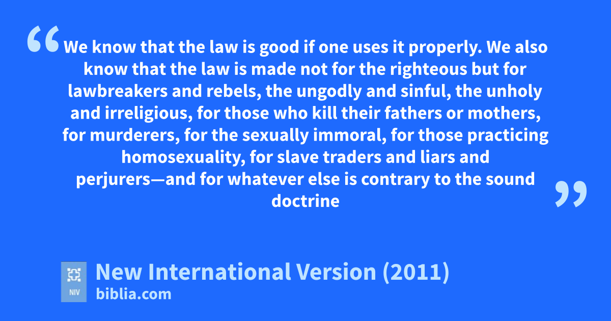 8 We know that the law is goodr if one uses it properly. 9 We also know that the law is made not for the righteouss but for lawbreakers and rebels,t the ungodly and sinful, the unholy and irreligious, for those who kill their fathers or mothers, for murderers, 10 for the sexually immoral, for those practicing homosexuality, for slave traders and liars and perjurers—and for whatever else is contrary to the sound doctrineu 11 that conforms to the gospel concerning the glory of the blessed God, which he entrusted to me.v