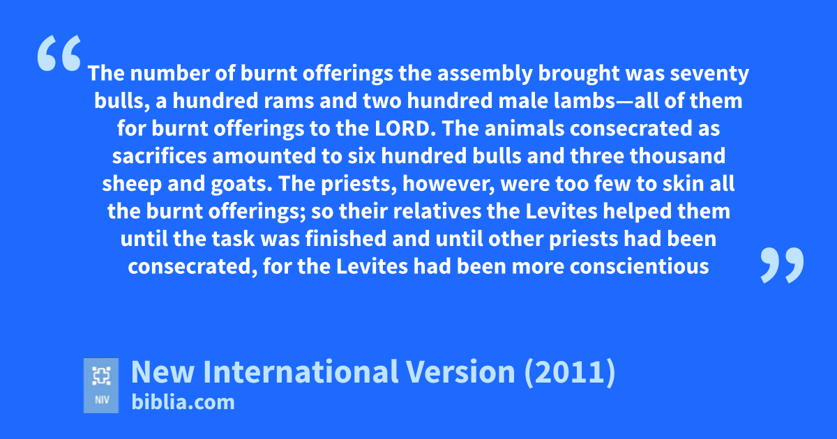 32 The number of burnt offeringsj the assembly brought was seventy bulls, a hundred rams and two hundred male lambs—all of them for burnt offerings to the Lord. 33 The animals consecrated as sacrifices amounted to six hundred bulls and three thousand sheep and goats. 34 The priests, however, were too few to skin all the burnt offerings;k so their relatives the Levites helped them until the task was finished and until other priests had been consecrated,l for the Levites had been more conscientious in consecrating themselves than the priests had been. 35 There were burnt offerings in abundance, together with the fatm of the fellowship offeringsn and the drink offeringso that accompanied the burnt offerings.