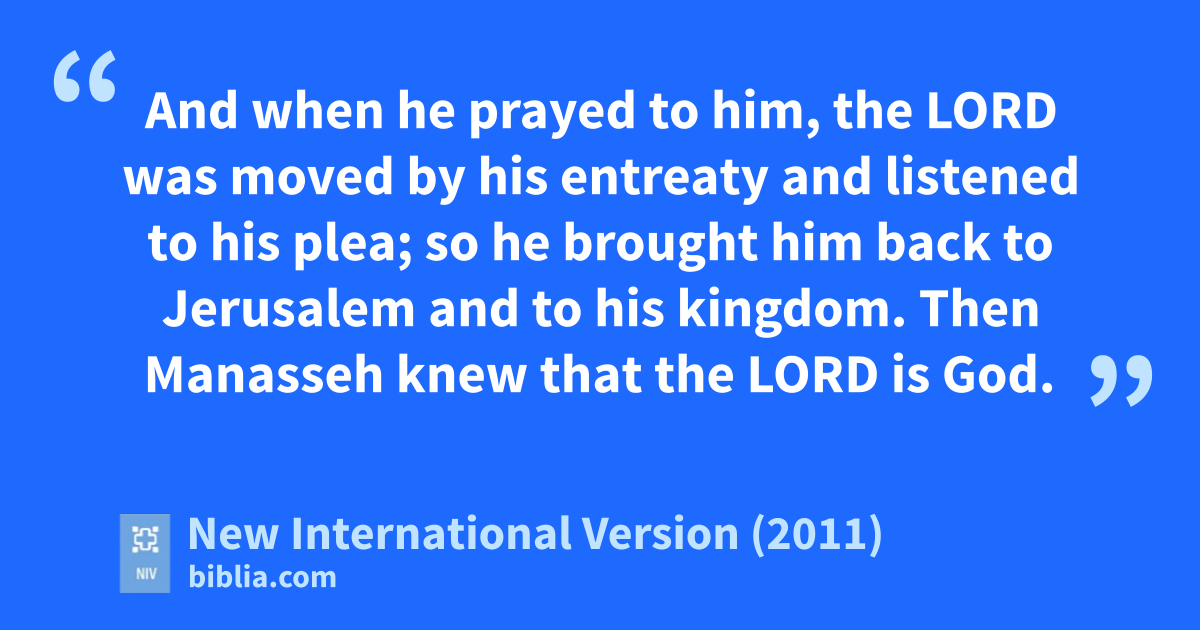 10 The Lord spoke to Manasseh and his people, but they paid no attention. 11 So the Lord brought against them the army commanders of the king of Assyria, who took Manasseh prisoner,z put a hooka in his nose, bound him with bronze shacklesb and took him to Babylon. 12 In his distress he sought the favor of the Lord his God and humbledc himself greatly before the God of his ancestors. 13 And when he prayed to him, the Lord was moved by his entreaty and listened to his plea; so he brought him back to Jerusalem and to his kingdom. Then Manasseh knew that the Lord is God.