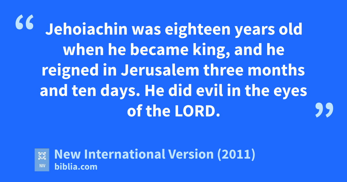 9 Jehoiachinz was eighteene years old when he became king, and he reigned in Jerusalem three months and ten days. He did evil in the eyes of the Lord. 10 In the spring, King Nebuchadnezzar sent for him and brought him to Babylon,a together with articles of value from the temple of the Lord, and he made Jehoiachin’s uncle,f Zedekiah, king over Judah and Jerusalem.