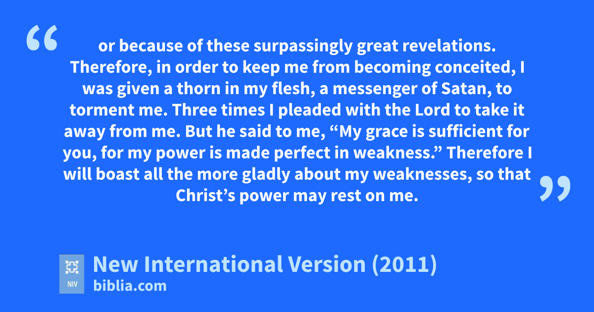 12 I must go on boasting.r Although there is nothing to be gained, I will go on to visions and revelationss from the Lord. 2 I know a man in Christt who fourteen years ago was caught upu to the third heaven.v Whether it was in the body or out of the body I do not know—God knows.w 3 And I know that this man—whether in the body or apart from the body I do not know, but God knows—4 was caught upx to paradisey and heard inexpressible things, things that no one is permitted to tell. 5 I will boast about a man like that, but I will not boast about myself, except about my weaknesses.z 6 Even if I should choose to boast,a I would not be a fool,b because I would be speaking the truth. But I refrain, so no one will think more of me than is warranted by what I do or say, 7 or because of these surpassingly great revelations.c Therefore, in order to keep me from becoming conceited, I was given a thorn in my flesh,d a messenger of Satan,e to torment me. 8 Three times I pleaded with the Lord to take it away from me.f 9 But he said to me, “My graceg is sufficient for you, for my powerh is made perfect in weakness.i”j Therefore I will boast all the more gladly about my weaknesses, so that Christ’s power may rest on me. 10 That is why, for Christ’s sake, I delightk in weaknesses, in insults, in hardships,l in persecutions,m in difficulties. For when I am weak, then I am strong.n