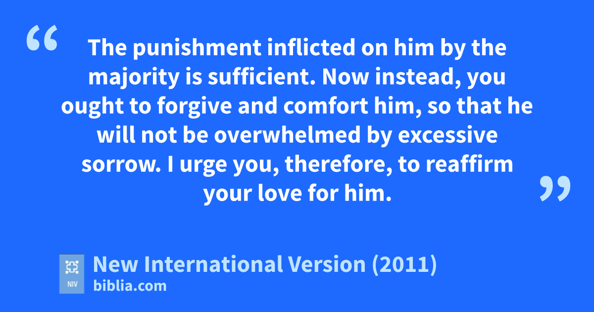 5 If anyone has caused grief,d he has not so much grieved me as he has grieved all of you to some extent—not to put it too severely. 6 The punishmente inflicted on him by the majority is sufficient. 7 Now instead, you ought to forgive and comfort him,f so that he will not be overwhelmed by excessive sorrow. 8 I urge you, therefore, to reaffirm your love for him. 9 Another reason I wrote youg was to see if you would stand the test and be obedient in everything.h 10 Anyone you forgive, I also forgive. And what I have forgiven—if there was anything to forgive—I have forgiven in the sight of Christ for your sake, 11 in order that Satani might not outwit us. For we are not unaware of his schemes.j