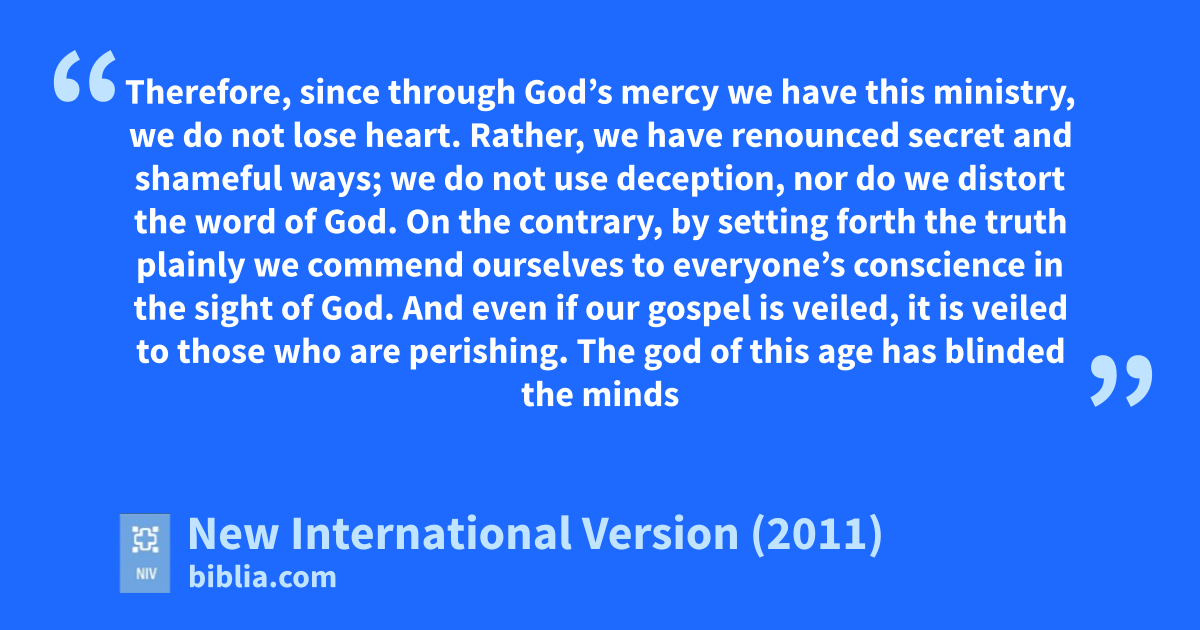 4 Therefore, since through God’s mercyd we have this ministry, we do not lose heart.e 2 Rather, we have renounced secret and shameful ways;f we do not use deception, nor do we distort the word of God.g On the contrary, by setting forth the truth plainly we commend ourselves to everyone’s conscienceh in the sight of God. 3 And even if our gospeli is veiled,j it is veiled to those who are perishing.k 4 The godl of this agem has blindedn the minds of unbelievers, so that they cannot see the light of the gospel that displays the glory of Christ,o who is the image of God.p 5 For what we preach is not ourselves,q but Jesus Christ as Lord,r and ourselves as your servantss for Jesus’ sake. 6 For God, who said, “Let light shine out of darkness,”a t made his light shine in our heartsu to give us the light of the knowledge of God’s glory displayed in the face of Christ.v