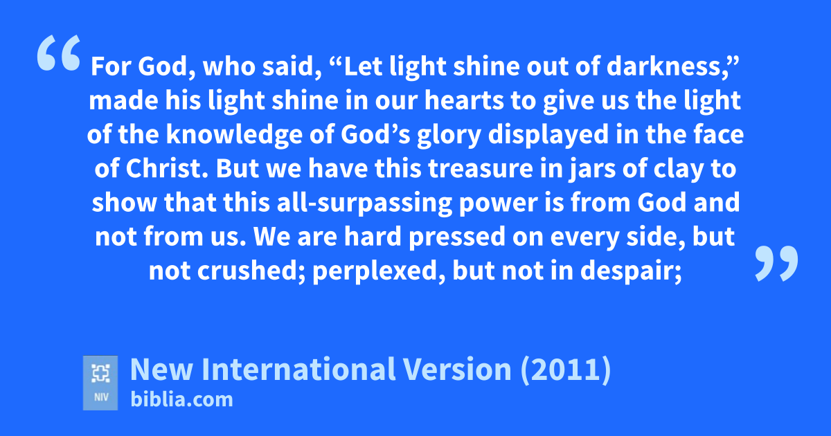 7 But we have this treasure in jars of clayw to show that this all-surpassing power is from Godx and not from us. 8 We are hard pressed on every side,y but not crushed; perplexed,z but not in despair; 9 persecuted,a but not abandoned;b struck down, but not destroyed.c 10 We always carry around in our body the death of Jesus,d so that the life of Jesus may also be revealed in our body.e 11 For we who are alive are always being given over to death for Jesus’ sake,f so that his life may also be revealed in our mortal body. 12 So then, death is at work in us, but life is at work in you.g