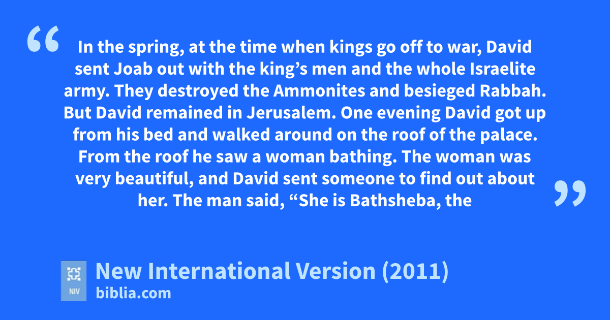 2 One evening David got up from his bed and walked around on the roofo of the palace. From the roof he sawp a woman bathing. The woman was very beautiful, 3 and David sent someone to find out about her. The man said, “She is Bathsheba,q the daughter of Eliamr and the wife of Uriahs the Hittite.” 4 Then David sent messengers to get her.t She came to him, and he sleptu with her. (Now she was purifying herself from her monthly uncleanness.)v Then she went back home. 5 The woman conceived and sent word to David, saying, “I am pregnant.”