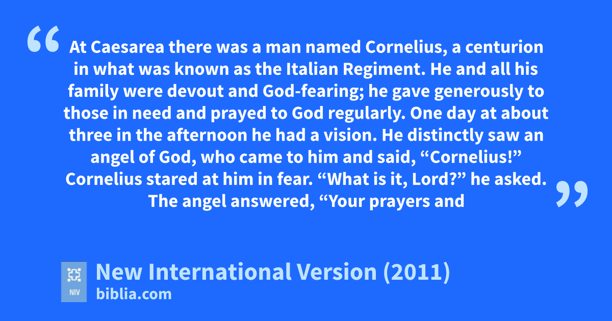 10 At Caesareal there was a man named Cornelius, a centurion in what was known as the Italian Regiment. 2 He and all his family were devout and God-fearing;m he gave generously to those in need and prayed to God regularly. 3 One day at about three in the afternoonn he had a vision.o He distinctly saw an angelp of God, who came to him and said, “Cornelius!”