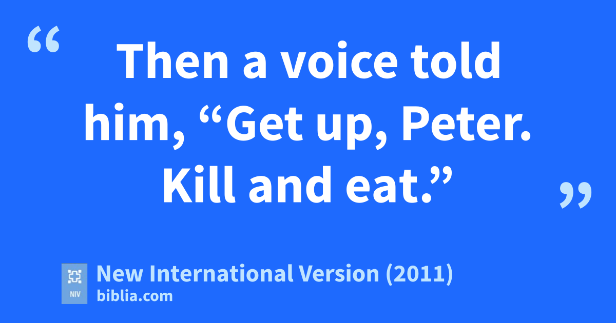 9 About noon the following day as they were on their journey and approaching the city, Peter went up on the roofv to pray. 10 He became hungry and wanted something to eat, and while the meal was being prepared, he fell into a trance.w 11 He saw heaven openedx and something like a large sheet being let down to earth by its four corners. 12 It contained all kinds of four-footed animals, as well as reptiles and birds. 13 Then a voice told him, “Get up, Peter. Kill and eat.”