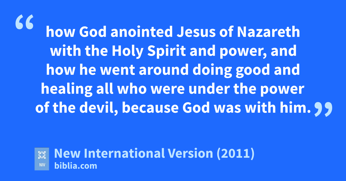 34 Then Peter began to speak: “I now realize how true it is that God does not show favoritismq 35 but accepts from every nation the one who fears him and does what is right.r 36 You know the messages God sent to the people of Israel, announcing the good newst of peaceu through Jesus Christ, who is Lord of all.v 37 You know what has happened throughout the province of Judea, beginning in Galilee after the baptism that John preached—38 how God anointedw Jesus of Nazareth with the Holy Spirit and power, and how he went around doing good and healingx all who were under the power of the devil, because God was with him.y