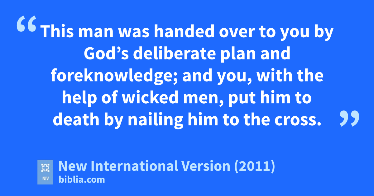 22 “Fellow Israelites, listen to this: Jesus of Nazarethq was a man accredited by God to you by miracles, wonders and signs,r which God did among you through him,s as you yourselves know. 23 This man was handed over to you by God’s deliberate plan and foreknowledge;t and you, with the help of wicked men,d put him to death by nailing him to the cross.u 24 But God raised him from the dead,v freeing him from the agony of death, because it was impossible for death to keep its hold on him.w 25 David said about him: