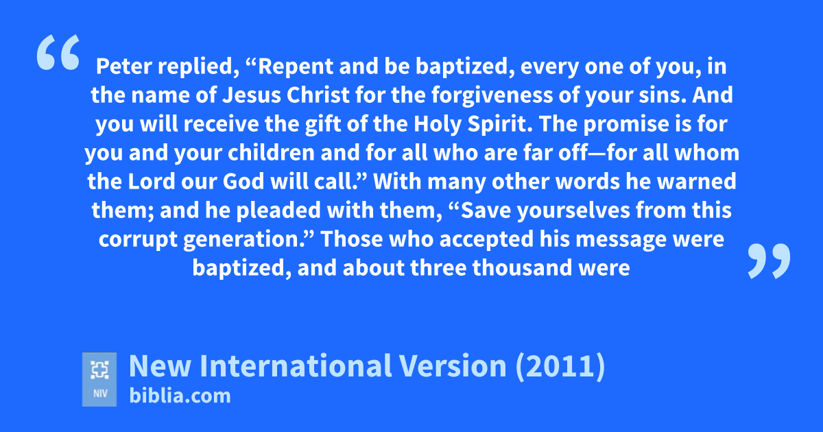 38 Peter replied, “Repent and be baptized,q every one of you, in the name of Jesus Christ for the forgiveness of your sins.r And you will receive the gift of the Holy Spirit.s 39 The promise is for you and your childrent and for all who are far offu—for all whom the Lord our God will call.”
