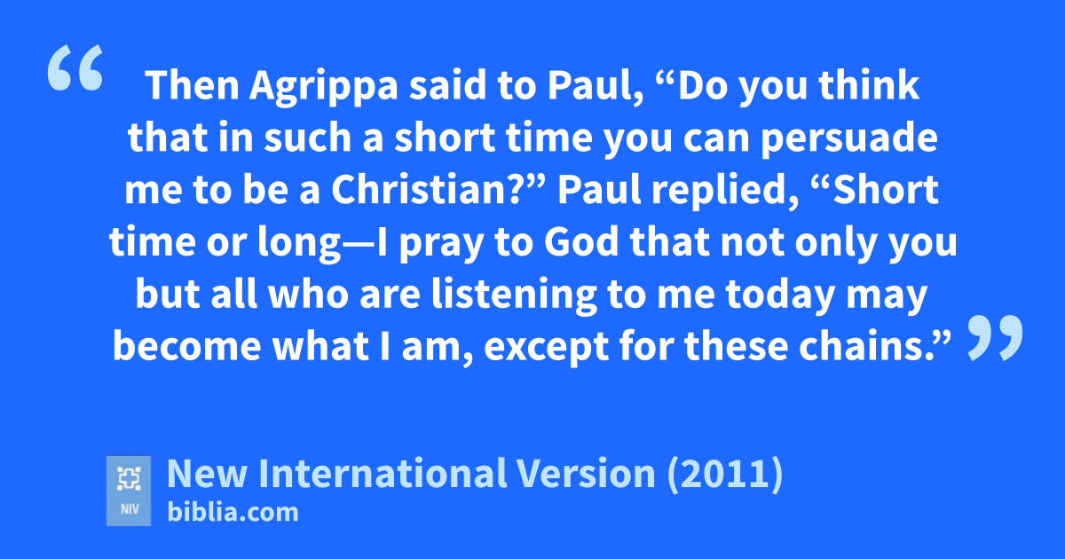 29 Paul replied, “Short time or long—I pray to God that not only you but all who are listening to me today may become what I am, except for these chains.”j