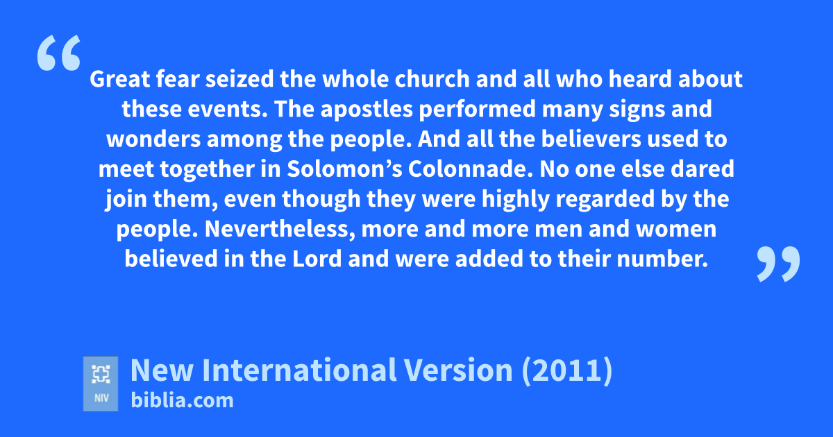 5 When Ananias heard this, he fell down and died.e And great fearf seized all who heard what had happened. 6 Then some young men came forward, wrapped up his body,g and carried him out and buried him.