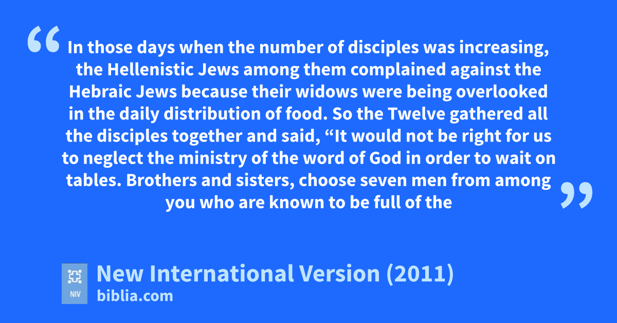 6 In those days when the number of disciples was increasing,d the Hellenistic Jewsa e among them complained against the Hebraic Jews because their widowsf were being overlooked in the daily distribution of food.g 2 So the Twelve gathered all the disciplesh together and said, “It would not be right for us to neglect the ministry of the word of Godi in order to wait on tables. 3 Brothers and sisters,j choose seven men from among you who are known to be full of the Spiritk and wisdom. We will turn this responsibility over to theml 4 and will give our attention to prayerm and the ministry of the word.”