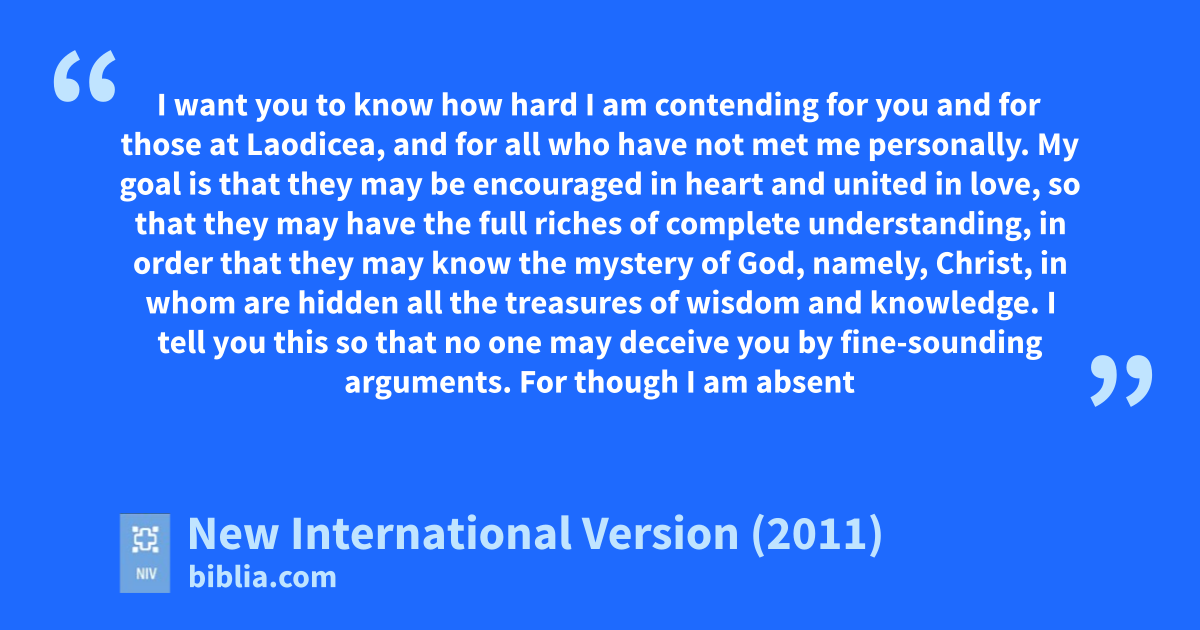 2 I want you to know how hard I am contendingz for you and for those at Laodicea,a and for all who have not met me personally. 2 My goal is that they may be encouraged in heartb and united in love, so that they may have the full riches of complete understanding, in order that they may know the mysteryc of God, namely, Christ, 3 in whom are hidden all the treasures of wisdom and knowledge.d 4 I tell you this so that no one may deceive you by fine-sounding arguments.e 5 For though I am absent from you in body, I am present with you in spiritf and delight to see how disciplinedg you are and how firmh your faith in Christi is.