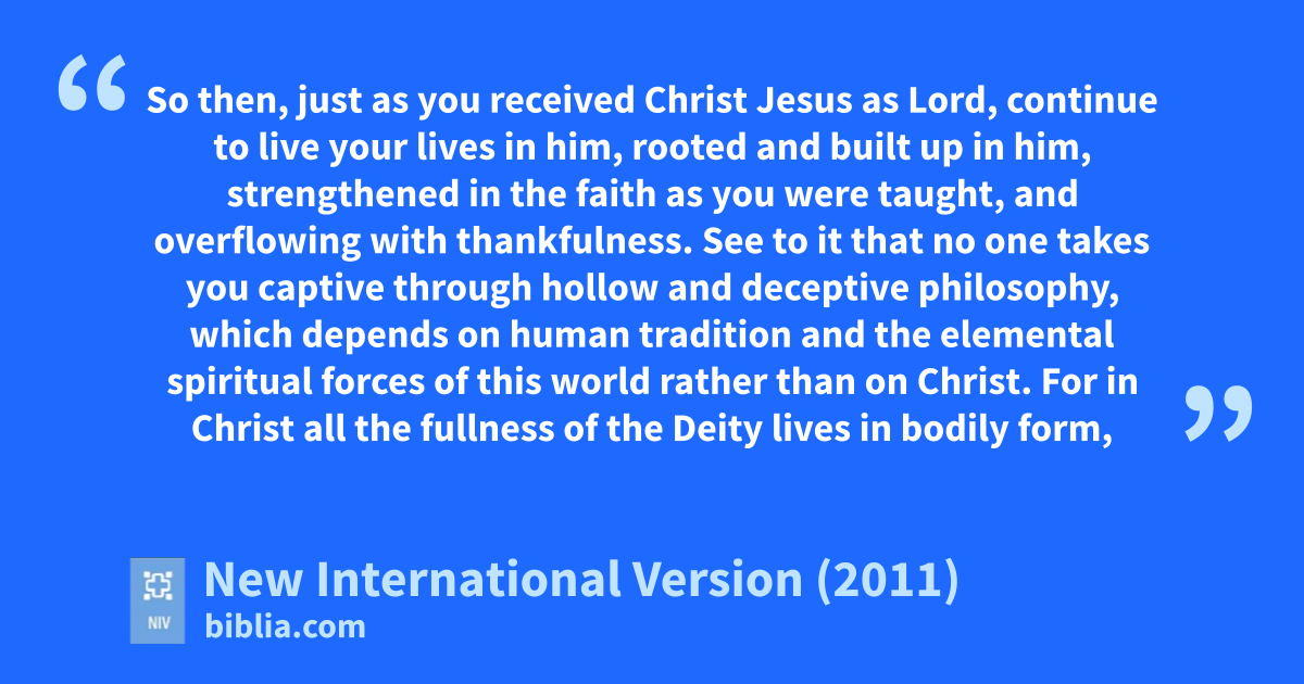 6 So then, just as you received Christ Jesus as Lord,j continue to live your lives in him, 7 rootedk and built up in him, strengthened in the faith as you were taught,l and overflowing with thankfulness.