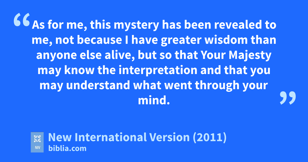 29 “As Your Majesty was lying there, your mind turned to things to come, and the revealer of mysteries showed you what is going to happen.j 30 As for me, this mystery has been revealedk to me, not because I have greater wisdom than anyone else alive, but so that Your Majesty may know the interpretation and that you may understand what went through your mind.