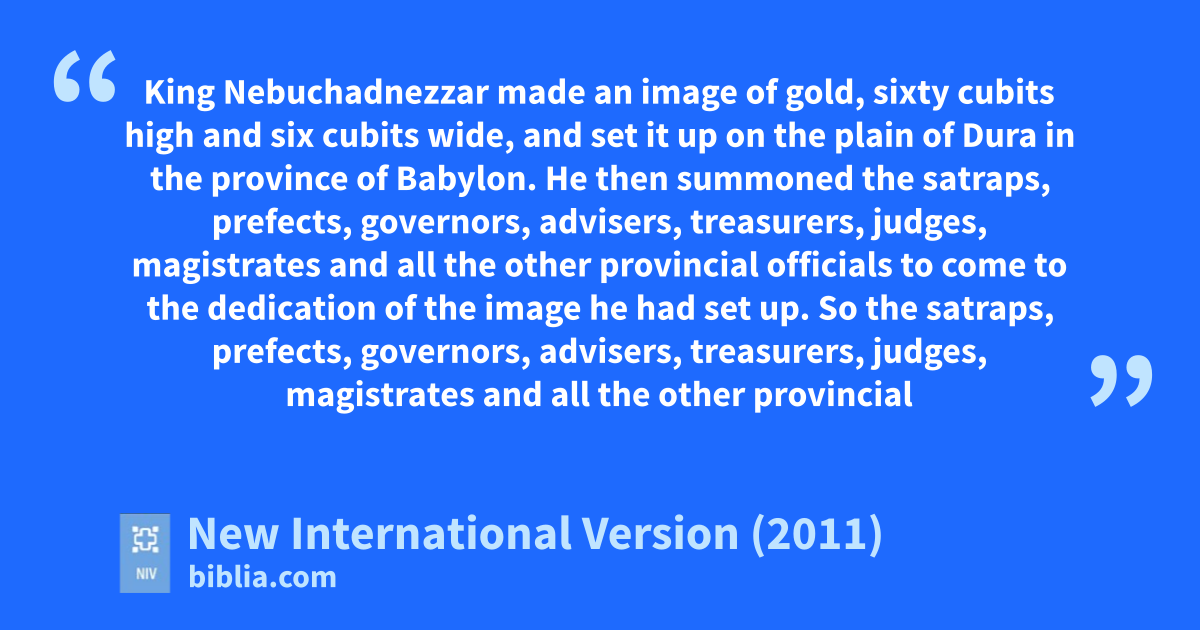 3 King Nebuchadnezzar made an imageq of gold, sixty cubits high and six cubits wide,a and set it up on the plain of Dura in the province of Babylon. 2 He then summoned the satraps,r prefects, governors, advisers, treasurers, judges, magistrates and all the other provincial officialss to come to the dedication of the image he had set up. 3 So the satraps, prefects, governors, advisers, treasurers, judges, magistrates and all the other provincial officials assembled for the dedication of the image that King Nebuchadnezzar had set up, and they stood before it.