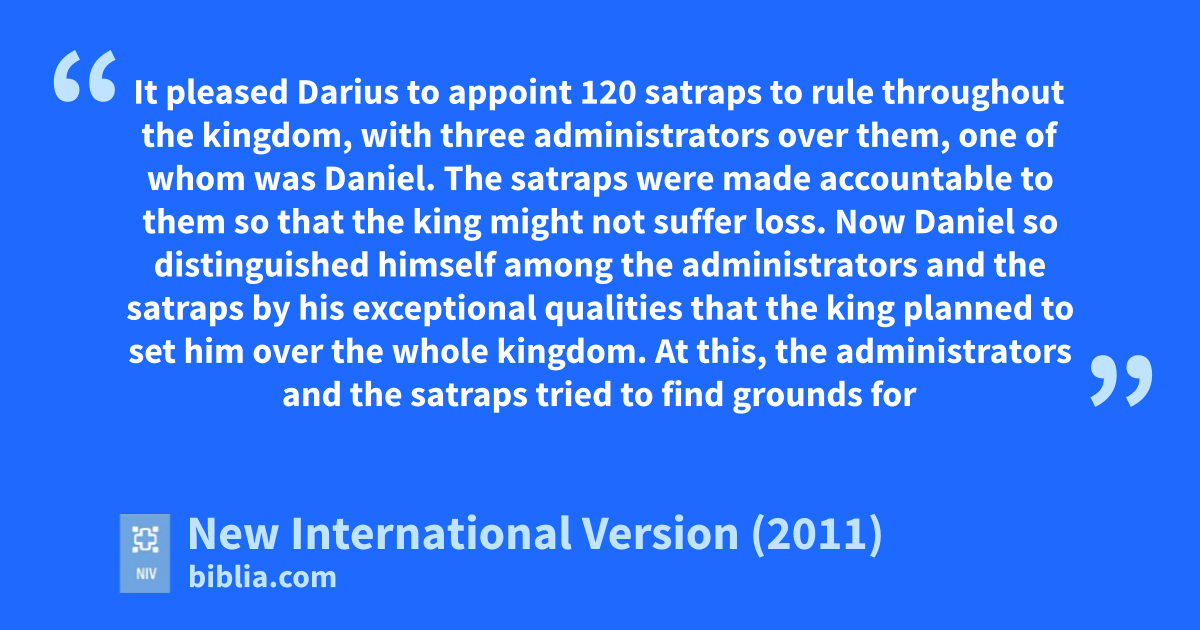 6 a It pleased Dariusq to appoint 120 satrapsr to rule throughout the kingdom, 2 with three administrators over them, one of whom was Daniel.s The satraps were made accountablet to them so that the king might not suffer loss. 3 Now Daniel so distinguished himself among the administrators and the satraps by his exceptional qualities that the king planned to set him over the whole kingdom.u 4 At this, the administrators and the satraps tried to find grounds for chargesv against Daniel in his conduct of government affairs, but they were unable to do so. They could find no corruption in him, because he was trustworthy and neither corrupt nor negligent. 5 Finally these men said, “We will never find any basis for charges against this man Daniel unless it has something to do with the law of his God.”w