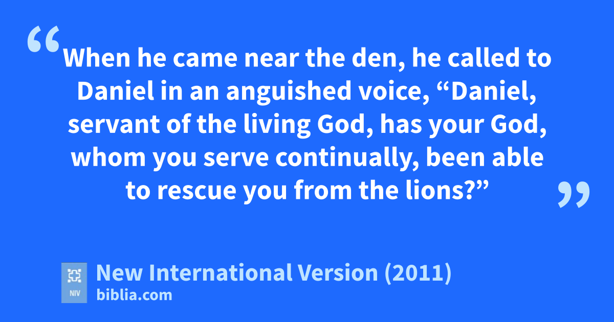 19 At the first light of dawn, the king got up and hurried to the lions’ den. 20 When he came near the den, he called to Daniel in an anguished voice, “Daniel, servant of the living God, has your God, whom you serve continually, been able to rescue you from the lions?”p