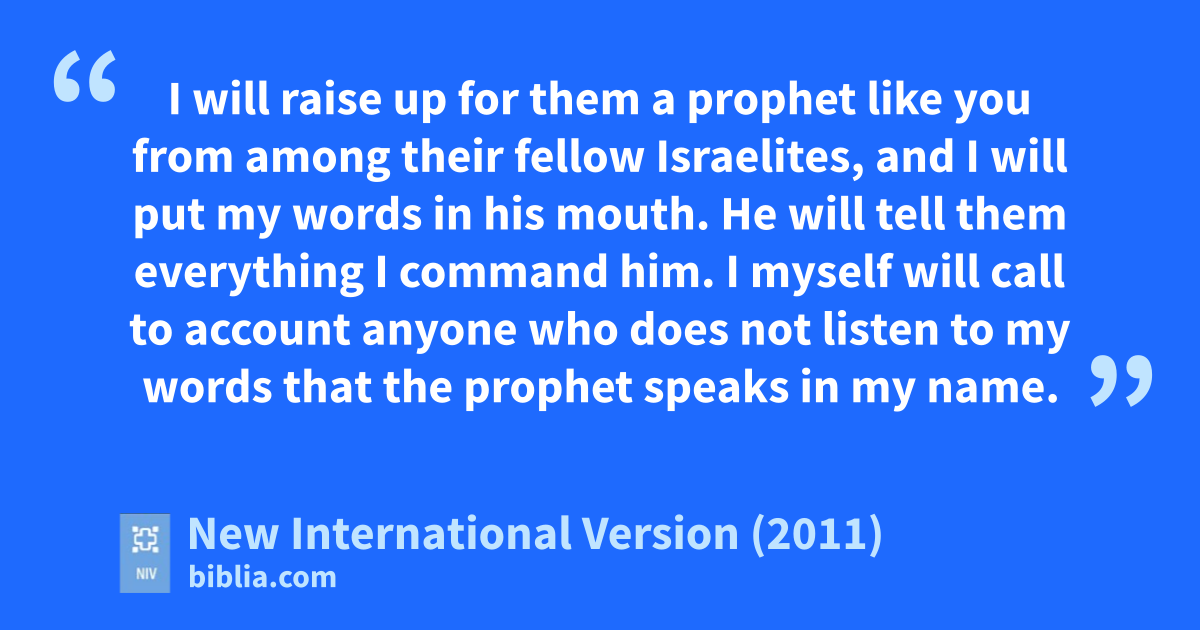 17 The Lord said to me: “What they say is good. 18 I will raise up for them a prophete like you from among their fellow Israelites, and I will put my wordsf in his mouth.g He will tell them everything I command him.h 19 I myself will call to accounti anyone who does not listenj to my words that the prophet speaks in my name.k 20 But a prophet who presumes to speak in my name anything I have not commanded, or a prophet who speaks in the name of other gods,l is to be put to death.”m