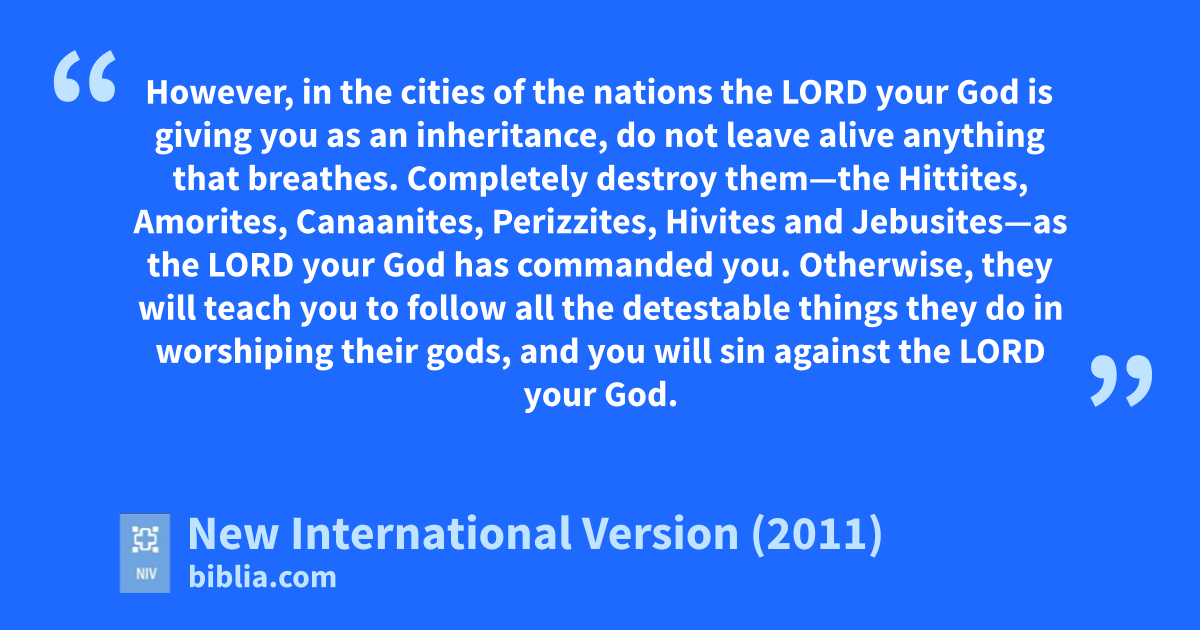 16 However, in the cities of the nations the Lord your God is giving you as an inheritance, do not leave alive anything that breathes.e 17 Completely destroya them—the Hittites, Amorites, Canaanites, Perizzites, Hivites and Jebusites—as the Lord your God has commanded you. 18 Otherwise, they will teach you to follow all the detestable things they do in worshiping their gods,f and you will sing against the Lord your God.