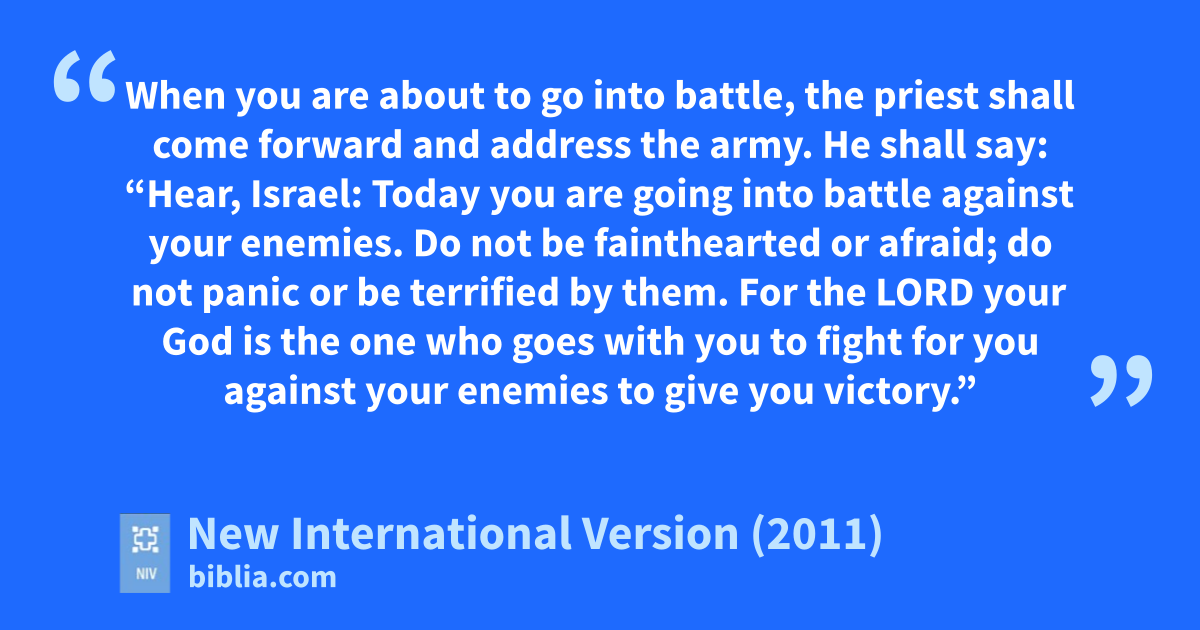 20 When you go to war against your enemies and see horses and chariots and an army greater than yours,j do not be afraidk of them,l because the Lord your God, who brought you up out of Egypt, will be withm you. 2 When you are about to go into battle, the priest shall come forward and address the army. 3 He shall say: “Hear, Israel: Today you are going into battle against your enemies. Do not be faintheartedn or afraid; do not panic or be terrified by them. 4 For the Lord your God is the one who goes with youo to fightp for you against your enemies to give you victory.q”