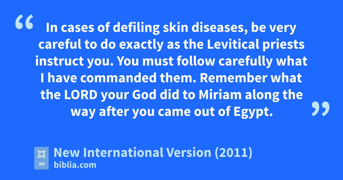 8 In cases of defiling skin diseases,a be very careful to do exactly as the Leviticalx priests instruct you. You must follow carefully what I have commanded them.y 9 Remember what the Lord your God did to Miriam along the way after you came out of Egypt.z