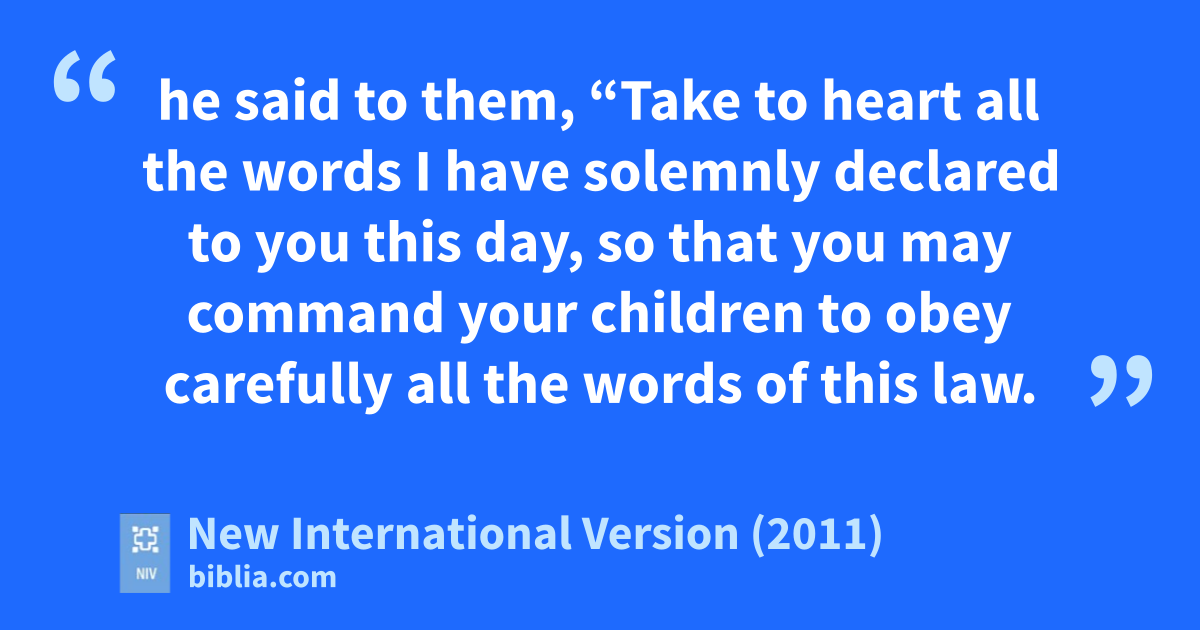 44 Moses came with Joshuag l son of Nun and spoke all the words of this song in the hearing of the people. 45 When Moses finished reciting all these words to all Israel, 46 he said to them, “Take to heart all the words I have solemnly declared to you this day,m so that you may commandn your children to obey carefully all the words of this law. 47 They are not just idle words for you—they are your life.o By them you will live longp in the land you are crossing the Jordan to possess.”