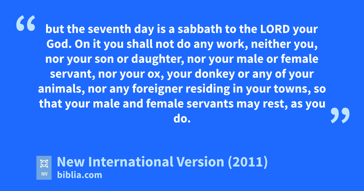 12 “Observe the Sabbath day by keeping it holy,i as the Lord your God has commanded you. 13 Six days you shall labor and do all your work, 14 but the seventh dayj is a sabbath to the Lord your God. On it you shall not do any work, neither you, nor your son or daughter, nor your male or female servant,k nor your ox, your donkey or any of your animals, nor any foreigner residing in your towns, so that your male and female servants may rest, as you do.l 15 Remember that you were slavesm in Egypt and that the Lord your God brought you out of there with a mighty handn and an outstretched arm.o Therefore the Lord your God has commanded you to observe the Sabbath day.