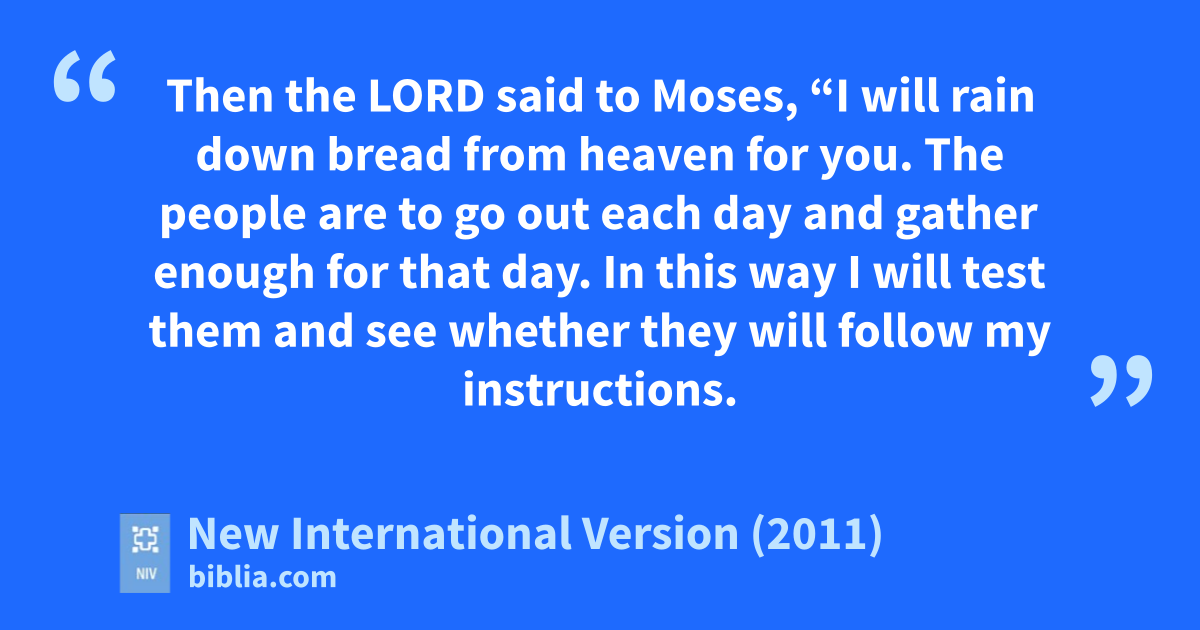4 Then the Lord said to Moses, “I will rain down bread from heavent for you. The people are to go out each day and gather enough for that day. In this way I will testu them and see whether they will follow my instructions. 5 On the sixth day they are to prepare what they bring in, and that is to be twicev as much as they gather on the other days.”