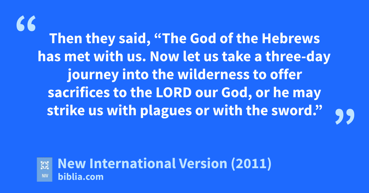 3 Then they said, “The God of the Hebrews has met with us. Now let us take a three-day journeyn into the wilderness to offer sacrifices to the Lord our God, or he may strike us with plagueso or with the sword.”