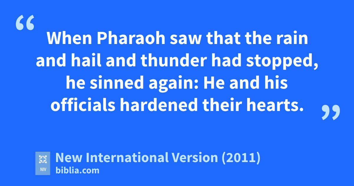33 Then Moses left Pharaoh and went out of the city. He spread out his hands toward the Lord; the thunder and hail stopped, and the rain no longer poured down on the land. 34 When Pharaoh saw that the rain and hail and thunder had stopped, he sinned again: He and his officials hardened their hearts. 35 So Pharaoh’s heartr was hard and he would not let the Israelites go, just as the Lord had said through Moses.