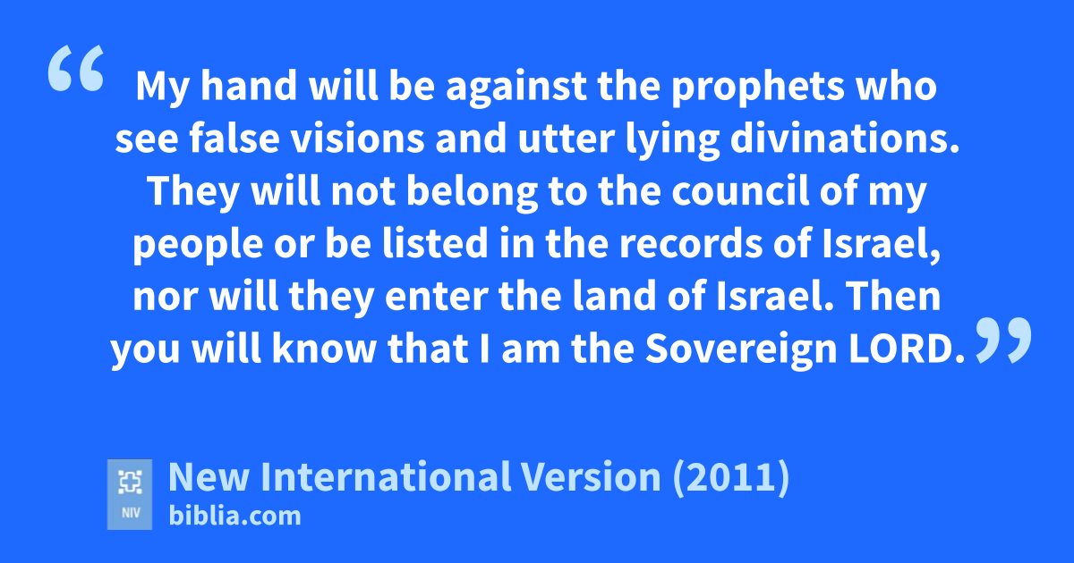 8 “ ‘Therefore this is what the Sovereign Lord says: Because of your false words and lying visions, I am against you,s declares the Sovereign Lord. 9 My hand will be against the prophets who see false visions and utter lyingt divinations. They will not belong to the council of my people or be listed in the recordsu of Israel, nor will they enter the land of Israel. Then you will know that I am the Sovereign Lord.v