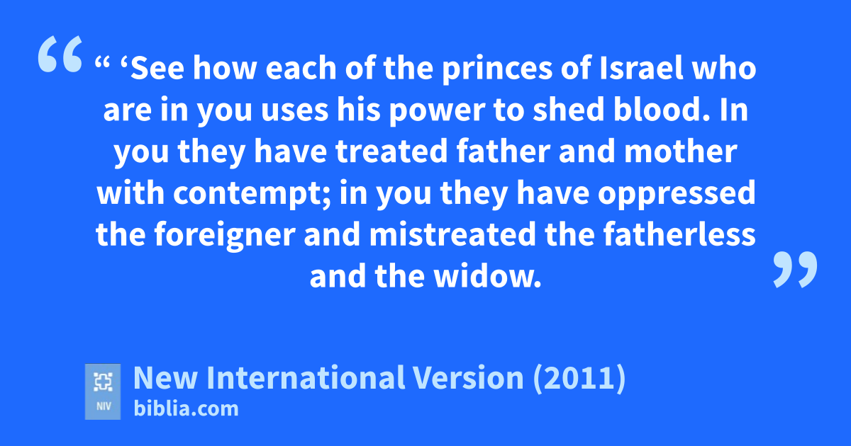 6 “ ‘See how each of the princes of Israel who are in you uses his power to shed blood.j 7 In you they have treated father and mother with contempt;k in you they have oppressed the foreignerl and mistreated the fatherless and the widow.m 8 You have despised my holy things and desecrated my Sabbaths.n 9 In you are slandererso who are bent on shedding blood;p in you are those who eat at the mountain shrinesq and commit lewd acts.r 10 In you are those who dishonor their father’s bed;s in you are those who violate women during their period,t when they are ceremonially unclean.u 11 In you one man commits a detestable offense with his neighbor’s wife,v another shamefully defiles his daughter-in-law,w and another violates his sister,x his own father’s daughter.y 12 In you are people who accept bribesz to shed blood; you take interesta and make a profit from the poor. You extort unjust gain from your neighbors.b And you have forgottenc me, declares the Sovereign Lord.d